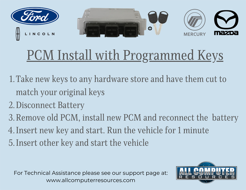 Simple. Your module will be VIN programmed specifically to your vehicle for a "Plug & Play" Hassle-Free Installation allowing you to avoid heavy dealer cost and fees. If your vehicle is equipped with Ford PATS Security (Passive Anti-Theft System) you will receive 2 pre-programmed keys with key codes. Just take the keys to your local hardware store and have them cut to your original key. PCM & keys will be Plug and Play.